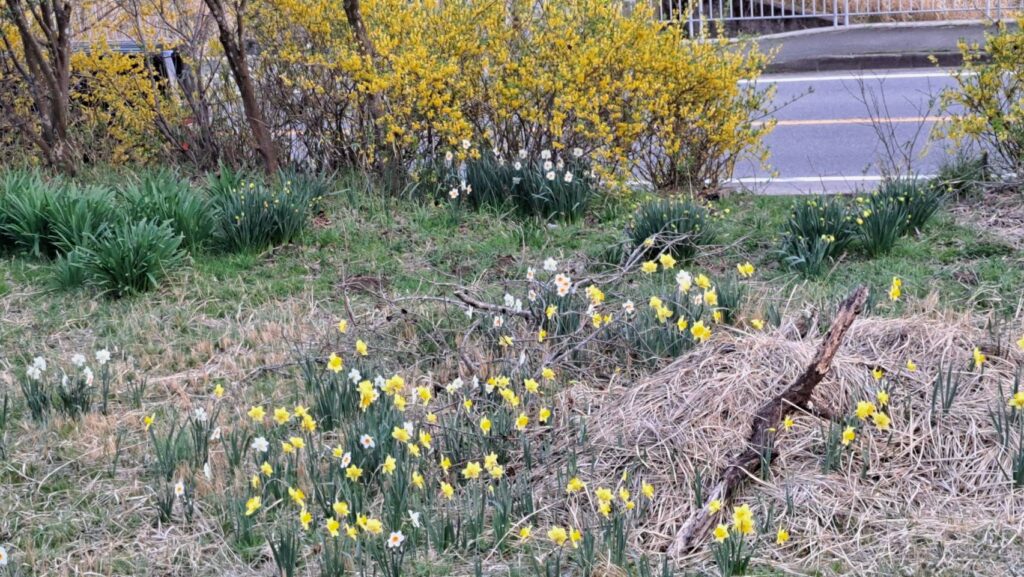 白や黄色の水仙に黄色のレンギョウ、サンシュユ、そして桜が花盛り~🌸🌸🌸🌸🌸🌸