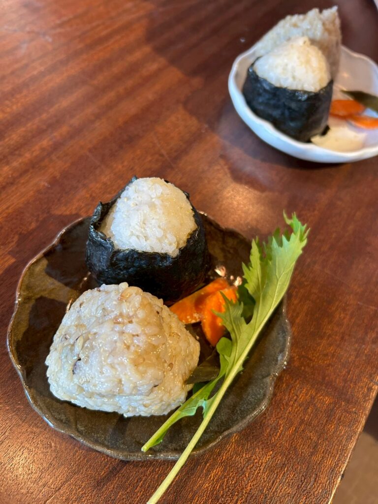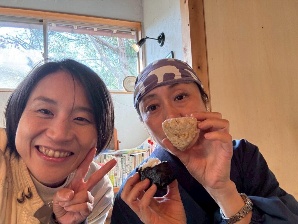 おにぎり🍙、漬物、豚汁に、今橋さんの育てた水菜とルッコラ🌱