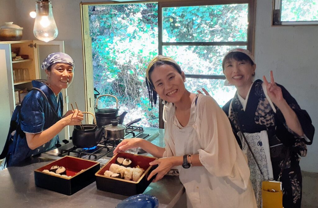 4、5人のグループに分かれ、おにぎり🍙を囲み